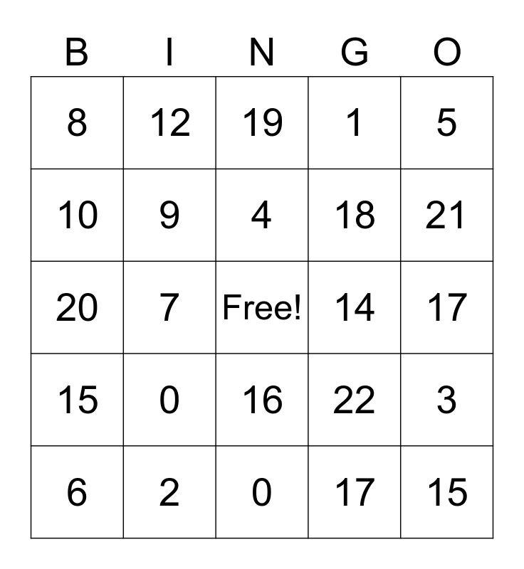 This bingo card has a free space and 24 words: 0, 2, 4, 6, 5, 8, 10, 12, 14, 16, 18, 20, 22, 3, 9, 17, 17, 19, 21, 7, 15, 15, 1 and 0.