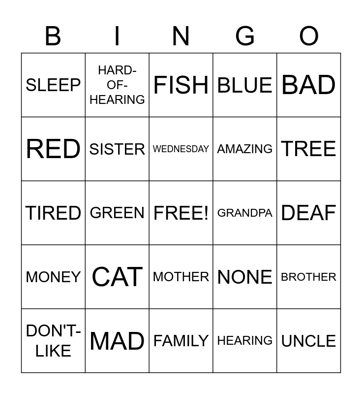 This bingo card has a free space and 24 words: CAT, MAD, WEDNESDAY, DON'T-LIKE, BAD, SLEEP, RED, HARD-OF-HEARING, GRANDPA, MOTHER, AMAZING, TIRED, NONE, BROTHER, SISTER, HEARING, DEAF, FISH, TREE, GREEN, UNCLE, MONEY, BLUE and FAMILY.