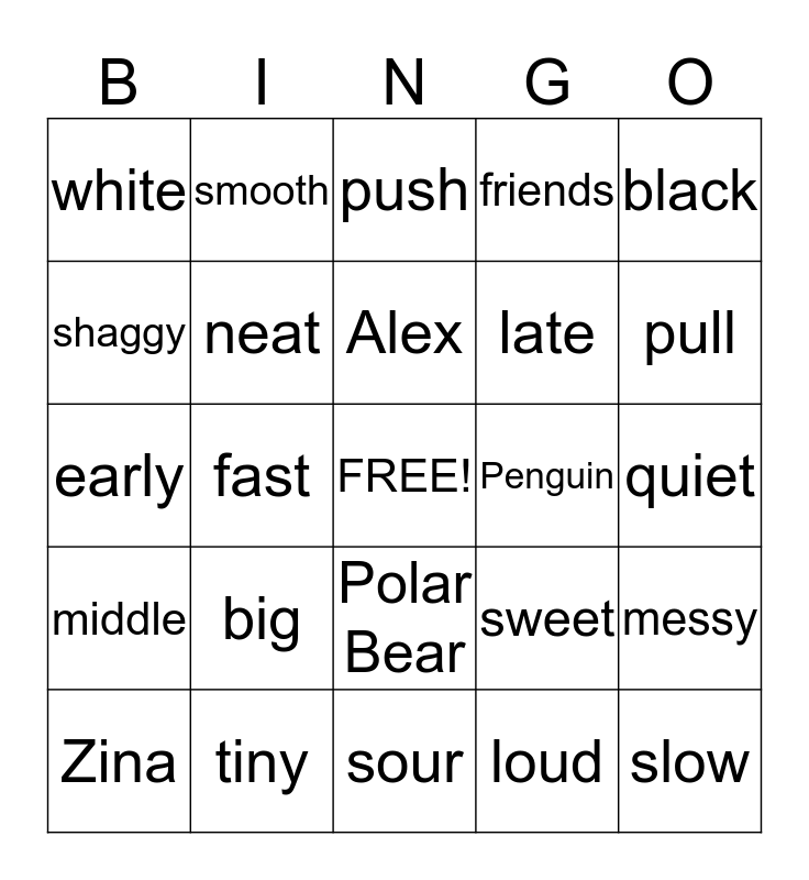 This bingo card has a free space and 24 words: big, tiny, Alex, Zina, black, white, shaggy, smooth, Penguin, Polar Bear, late, early, sweet, messy, neat, loud, quiet, push, pull, fast, slow, middle, friends and sour.
