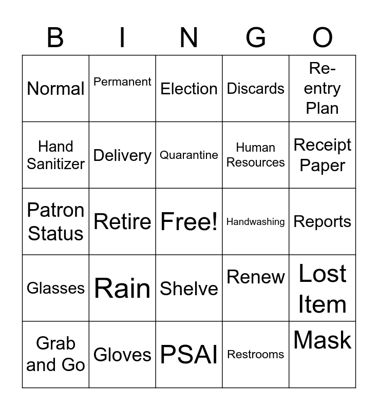 This bingo card has a free space and 24 words: Grab and Go, Rain, Quarantine, Restrooms, Re-entry Plan, Normal, Permanent, Election, Handwashing, Reports, Patron Status, Delivery, Renew, Lost Item, Hand Sanitizer, Gloves, PSAI, Discards, Receipt Paper, Glasses, Retire, Shelve, Human Resources and Mask.