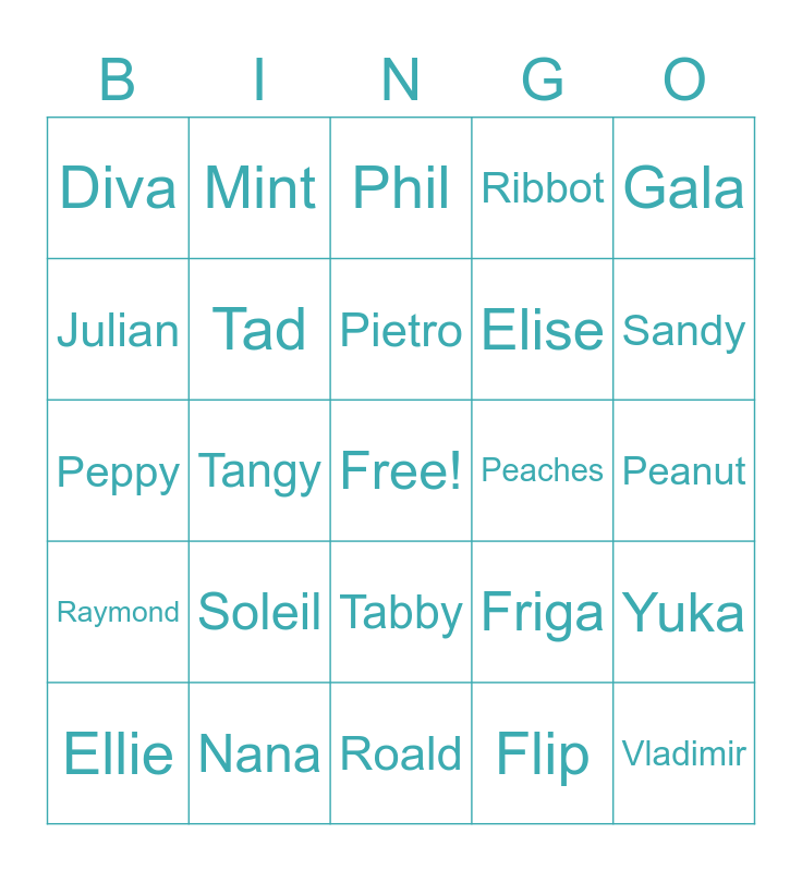 This bingo card has a free space and 24 words: Soleil, Nana, Pietro, Ellie, Gala, Diva, Julian, Mint, Peaches, Tabby, Elise, Peppy, Friga, Yuka, Tad, Flip, Peanut, Phil, Sandy, Tangy, Vladimir, Raymond, Ribbot and Roald.