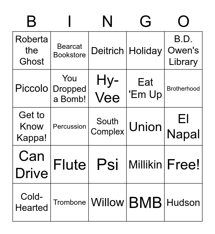 This bingo card has 87 words: Kappa, Parker Worden, Psi, Kappa Kappa Psi, Carnation, Dr. Strickland, Liam Strickland, A&G, Taco John's, Taco Bell, Applebee's, El Maguey, Free!, El Napal, McDonalds, Hy-Vee, Walmart, Dollar Tree, Dollar General, Paint Along with a Brother!, Bingo!, Scattergories!, Get to Know Kappa!, Jeopardy!, BMB, Music, Trumpet, Mellophone, AltoSax, TenorSax, Trombone, Baritone, Clarinet, Flute, Piccolo, Service, Brotherhood, Musicianship, Leadership, Percussion, Garrett Strong, Wells, Valk, Union, Colden, B.D. Owen's Library, Union, Bearcat Bookstore, Bobby, Mike the Dog, Maryville, MO, Ashley Strickland, Can Drive, SAI, PMA, Tri-Fraternity, Eat 'Em Up, TouchDown, Jungle Boogie, Holiday, You Dropped a Bomb!, Call Me, Neck, Tag, Jr., Alma Mater, Star Spangled Banner, Cold-Hearted, South Complex, Hudson, Perrin, FVA, Deitrich, Millikin, Franken, Marm, Toby, Willow, Buckleigh, Bo, Boots, Star, Blue, White, Nicholas Shutts, Roberta the Ghost and Walter the Ghost.