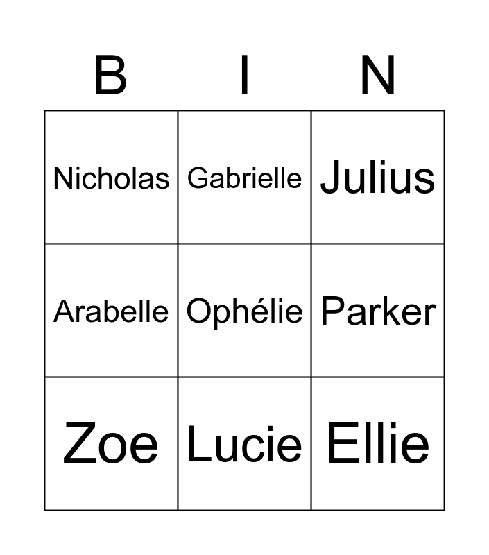 This bingo card has 22 words: Joshua, Max, Gabrielle, Lexi, Parker, Zoe, Nicholas, Julius, Arsema, Neven, Ellie, Arabelle, Lucy, Jack, Paxton, Anna, Imara, Joseph, Jeronimo, Ophélie, Lucie and Madilynn.