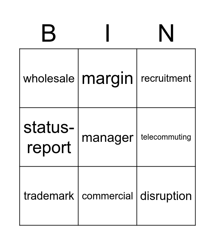 This bingo card has a free space and 8 words: telecommuting, recruitment, margin, trademark, wholesale, disruption, status-report and commercial.