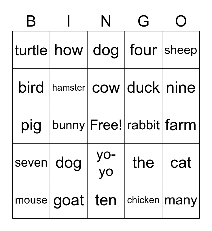 This bingo card has a free space and 24 words: dog, goat, cow, mouse, sheep, turtle, bird, how, rabbit, yo-yo, duck, pig, the, cat, hamster, chicken, farm, dog, nine, bunny, many, seven, four and ten.