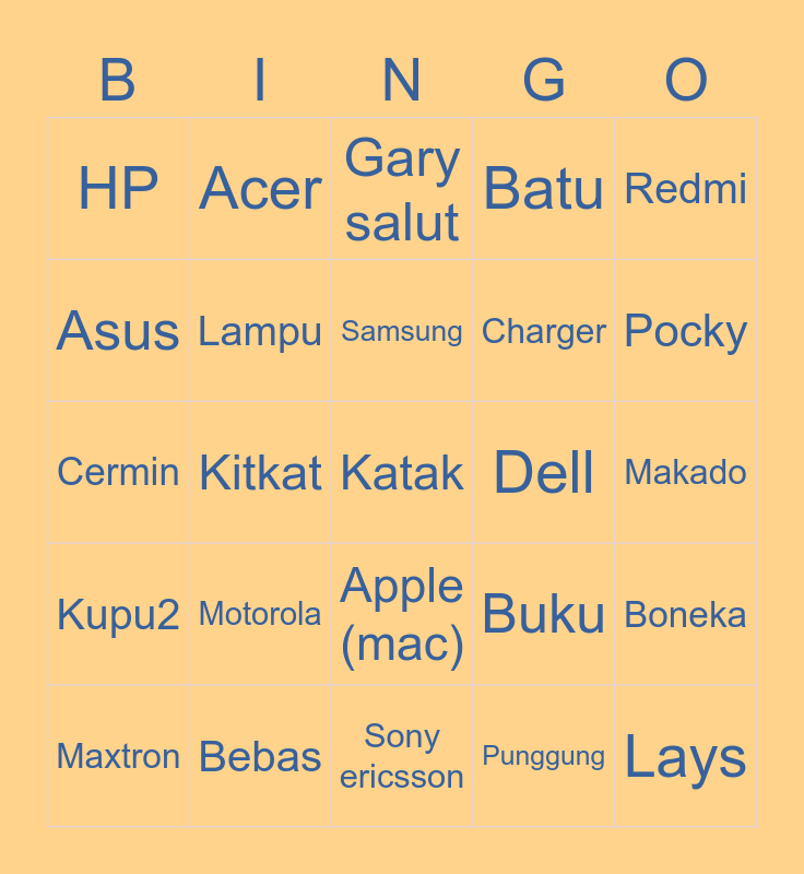 This bingo card has 25 words: Motorola, Sony ericsson, Samsung, Maxtron, Redmi, HP, Asus, Acer, Dell, Apple (mac), Charger, Cermin, Buku, Boneka, Lampu, Lays, Makado, Gary salut, Pocky, Kitkat, Katak, Bebas, Kupu2, Batu and Punggung.