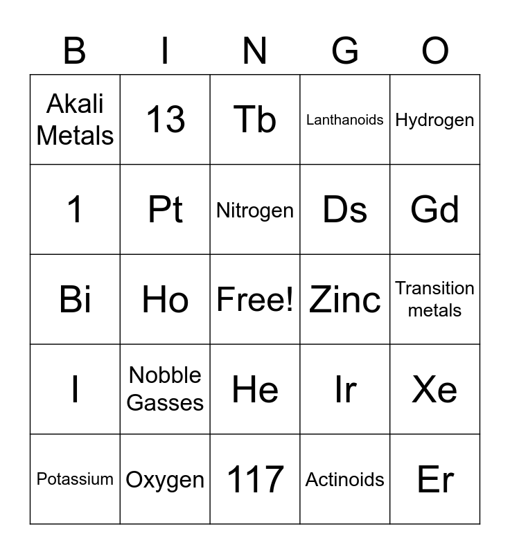 This bingo card has a free space and 24 words: Nobble Gasses, Oxygen, Nitrogen, Potassium, Hydrogen, Akali Metals, 1, 13, Zinc, He, Ds, Bi, Ir, Xe, Pt, Actinoids, Transition metals, Tb, Gd, Ho, Er, I, Lanthanoids and 117.
