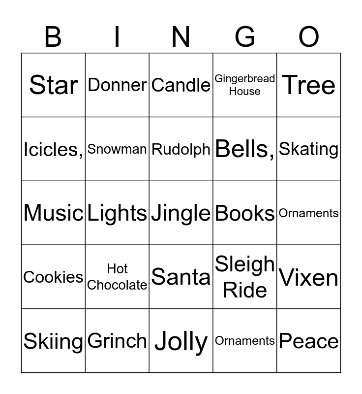 This bingo card has 63 words: FREE!, Dancer, Prancer, Vixen, Comet, Cupid, Donner, Blitzen,, Rudolph, Frosty, Santa, Candy Canes,, Ornaments, Tree, Snow, Icicles,, Lights, Star, Sled, Bells,, Hot Chocolate, Cookies, Gingerbread House, North Pole, December 25th,, Presents, Toys, Caroling, Mistletoe, Fruitcake, Angels, Holly, Cards, Sledding,, Skating, Skiing, Snowboarding, Ornaments, Silver & Gold, Snowman, Music, Books, Holiday, Coal, Jingle, Grinch, Peace, Sleigh Ride, Ho Ho Ho, Eggnog, Noel, Jolly, Feliz Navidad, Elf, Snowflakes, Candle, Choir, Turtle Dove,, Giving, Thankful, Generosity, Happy Holidays and Stocking.