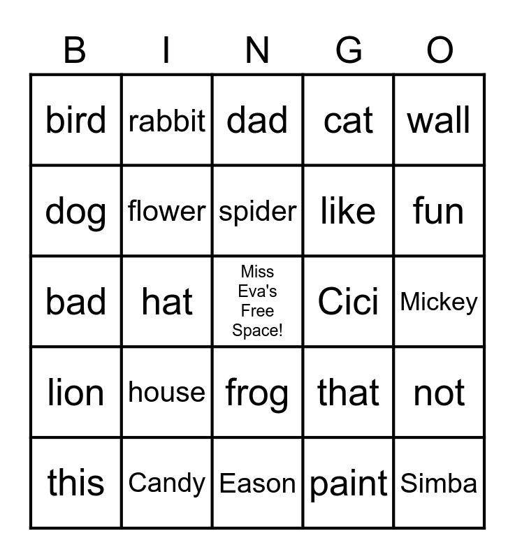 This bingo card has a free space and 29 words: this, bed, hat, fish, bird, dad, flower, house, Cici, Candy, Mickey, Simba, Eason, paint, fun, seed, frog, lion, wall, bad, that, pet, like, dog, cat, rabbit, not, spider and eat.