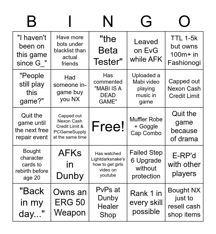 This bingo card has a free space and 24 words: AFKs in Dunby, Owns an ERG 50 Weapon, Has commented "MABI IS A DEAD GAME", "Back in my day...", TTL 1-5k but owns 100m+ in Fashionogi, "I haven't been on this game since G_", "People still play this game?", Have more bots under blacklist than actual friends, Muffler Robe + Goggle Cap Combo, Has watched Lightdarksnake's how to get girls video on youtube, Uploaded a Mabi video playing music in game, Quit the game until the next free repair event, Failed Step 6 Upgrade without protection, E-RP'd with other players, Had someone in-game buy you NX, Rank 1 in every skill possible, Quit the game because of drama, "the Beta Tester", Capped out Nexon Cash Credit Limit, Capped out Nexon Cash Credit Limit & PCGameSupply at the same time, Bought NX just to resell cash shop items, Bought character cards to rebirth before age 20, Leaved on EvG while AFK and PvPs at Dunby Healer Shop.