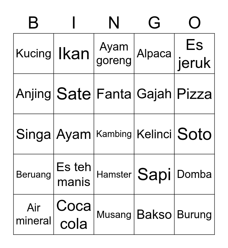 This bingo card has a free space and 24 words: Es teh manis, Coca cola, Fanta, Air mineral, Es jeruk, Kucing, Anjing, Ikan, Kelinci, Hamster, Gajah, Singa, Sapi, Domba, Sate, Bakso, Soto, Ayam goreng, Pizza, Ayam, Burung, Beruang, Alpaca and Musang.