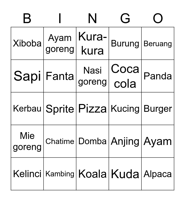 This bingo card has a free space and 24 words: Chatime, Kambing, Nasi goreng, Kelinci, Beruang, Xiboba, Sapi, Ayam goreng, Kucing, Domba, Coca cola, Kerbau, Anjing, Ayam, Fanta, Kuda, Burger, Kura-kura, Panda, Sprite, Alpaca, Mie goreng, Burung and Koala.