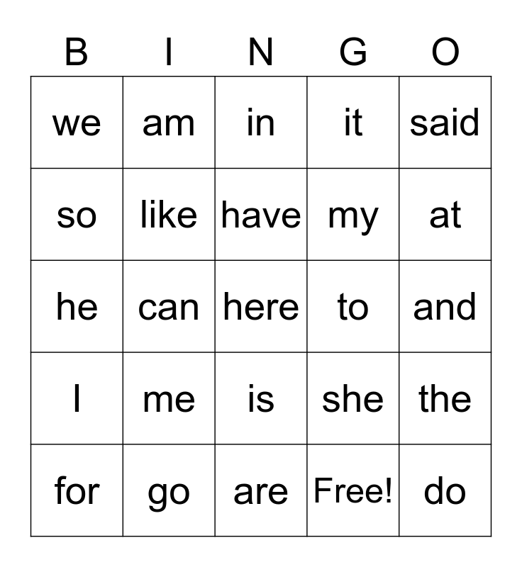 This bingo card has 32 words: Free!, a, can, has, I, like, said, the, am, do, have, in, look, see, to, an, for, he, is, me, she, up, and, go, here, it, my, so, we, are, no and at.