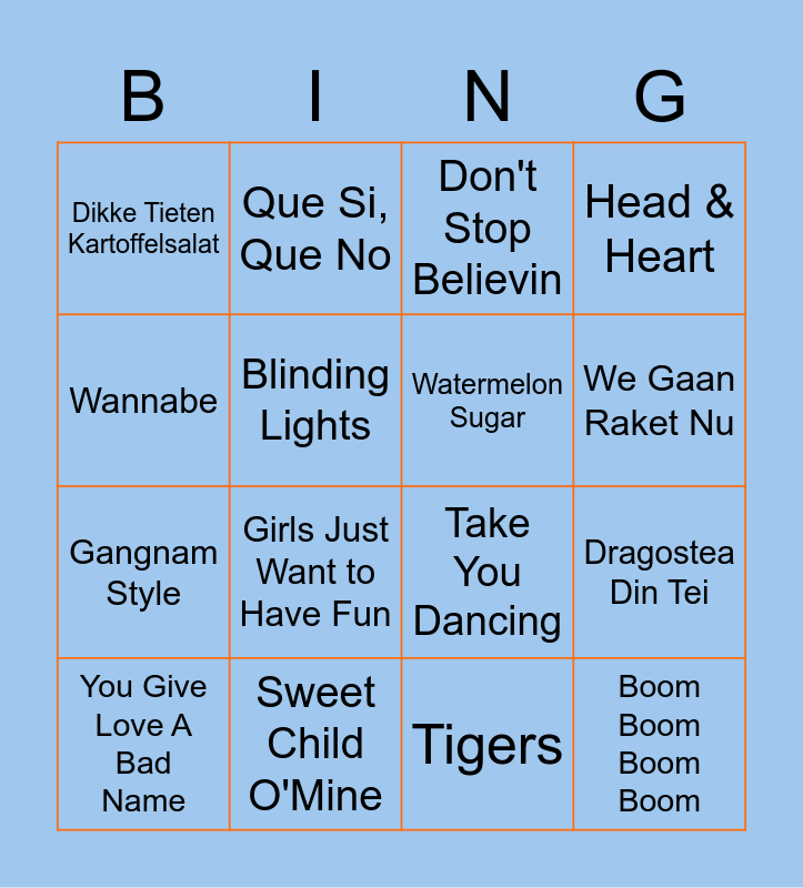 This bingo card has 36 words: Feesttent, Leef, Barbie Girl, Watermelon Sugar, De Overkant, Boom Boom Boom Boom, We Gaan Raket Nu, Kleur, Wannabe, Bloed, Zweet en Tranen, Dragostea Din Tei, Head & Heart, Tarzan & Jane, Sweet Child O'Mine, Girls Just Want to Have Fun, Dikke Tieten Kartoffelsalat, Bohemian Rhapsody, Ademloos Door De Nacht, You Give Love A Bad Name, Don't Stop Believin, Tigers, I'm Gonna Be (500 Miles), Wonderwall, Fuifje, Más Más Más, Que Si, Que No, Take You Dancing, Duurt Te Lang, Gangnam Style, Blinding Lights, Mi Rowsu, Atemlos durch die Nacht, Springen, U Can't Touch This, Alane and Atje Voor De Sfeer.