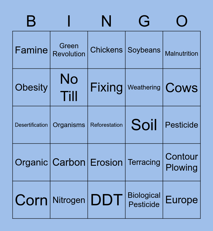 This bingo card has a free space and 24 words: Carbon, Nitrogen, Fixing, Corn, Malnutrition, Famine, Obesity, Green Revolution, Soil, Erosion, Weathering, Desertification, Terracing, Contour Plowing, No Till, Biological Pesticide, Pesticide, Chickens, Cows, Organisms, Europe, Organic, Soybeans and DDT.