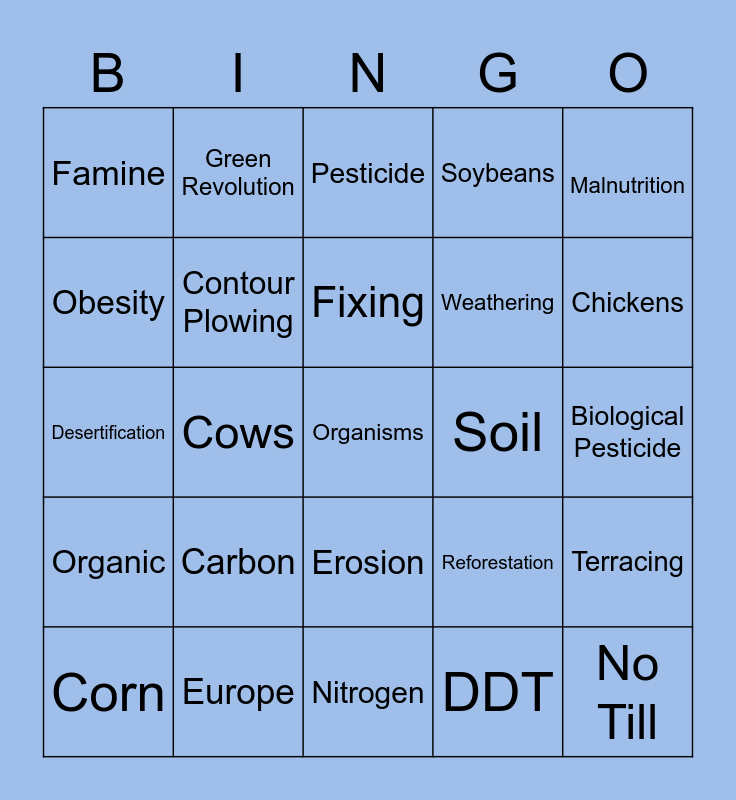 This bingo card has 25 words: Carbon, Nitrogen, Fixing, Corn, Malnutrition, Famine, Obesity, Green Revolution, Soil, Erosion, Weathering, Desertification, Reforestation, Terracing, Contour Plowing, No Till, Biological Pesticide, Pesticide, Chickens, Cows, Organisms, Europe, Organic, Soybeans and DDT.