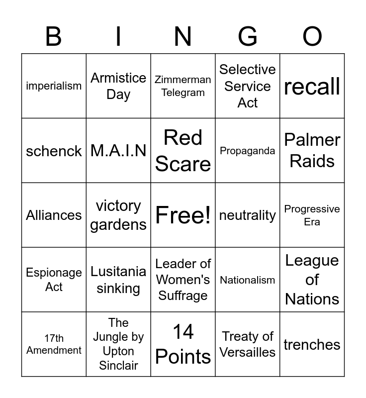 This bingo card has a free space and 29 words: 17th Amendment, Spanish-American War, victory gardens, Panama Canal, imperialism, Zimmerman Telegram, M.A.I.N, Lusitania sinking, neutrality, The Jungle by Upton Sinclair, Progressive Era, trenches, 14 Points, Treaty of Versailles, Palmer Raids, Theodore Roosevelt, Leader of Women's Suffrage, Espionage Act, recall, Alliances, Nationalism, Militarism, Propaganda, schenck, Selective Service Act, Armistice Day, League of Nations, Red Scare and Beautemous.