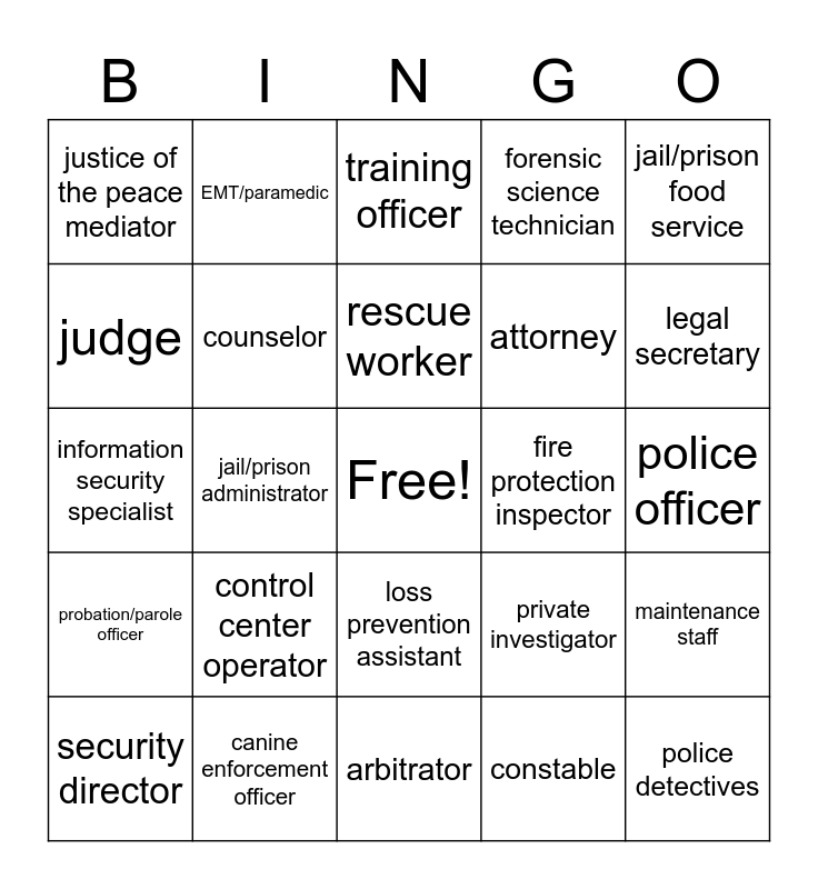This bingo card has a free space and 32 words: constable, sheriff, jail/prison administrator, correctional officer, probation/parole officer, counselor, jail/prison food service, maintenance staff, EMT/paramedic, firefighter, rescue worker, training officer, emergency dispatcher, emergency planning manager, fire protection inspector, security guard, security director, information security specialist, loss prevention assistant, control center operator, private investigator, animal control officer, police officer, canine enforcement officer, police detectives, forensic science technician, attorney, judge, justice of the peace mediator, arbitrator, court reporter and legal secretary.