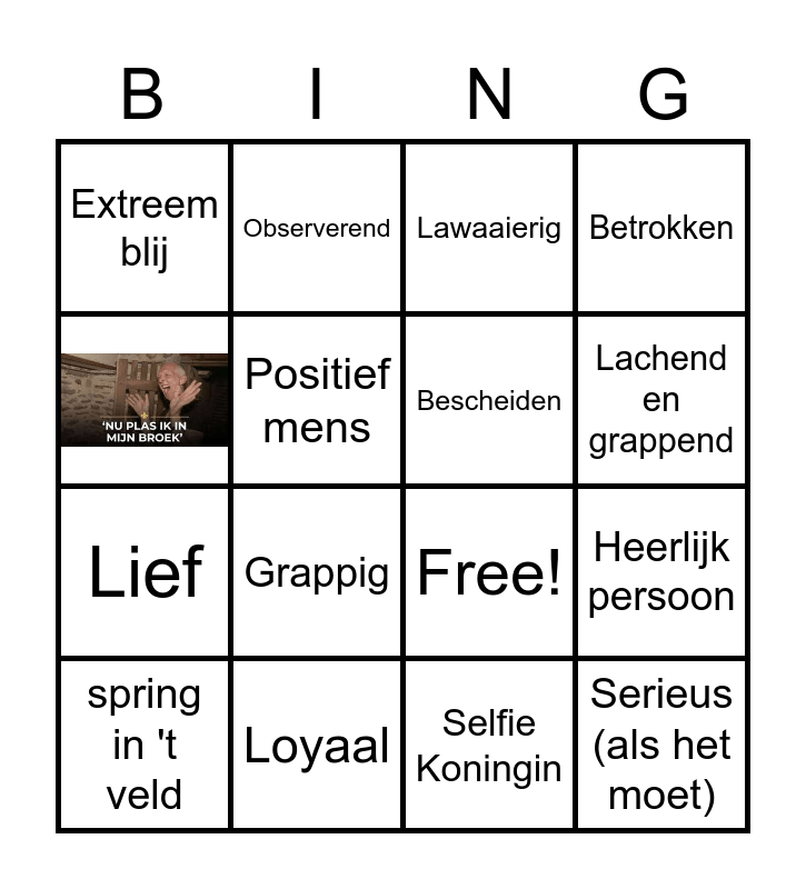 This bingo card has 3 images and 18 words: Loyaal, Genietend, Observerend, Enthousiast, Selfie Koningin, Bescheiden, Extreem blij, Lawaaierig, Free!, Lachend en grappend, Lief, Betrokken, Serieus (als het moet), Harde weker, Positief mens, spring in 't veld, Grappig and Heerlijk persoon.