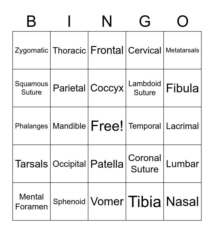 This bingo card has a free space and 29 words: Mental Foramen, Maxilla, Mandible, Alveolar Margins, Zygomatic, Frontal, Parietal, Occipital, Temporal, Sphenoid, Lacrimal, Nasal, Vomer, Tibia, Fibula, Femur, Patella, Tarsals, Metatarsals, Phalanges, Coronal Suture, Intervertebral Discs, Lambdoid Suture, Squamous Suture, Cervical, Thoracic, Lumbar, Coccyx and Sacrum.