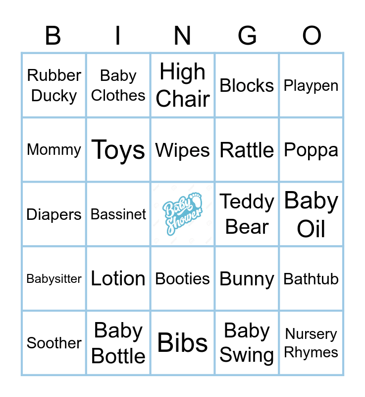 This bingo card has a free space and 60 words: Bath, Baby Bottle, Gifts, Babysitter, Baby Swing, Blanket, Toys, Crib, Rattle, Cradle, Blocks, Milk, Mommy, Daddy, Nursery, Rubber Ducky, Nursery Rhymes, Playpen, Teether, Wipes, Teddy Bear, High Chair, Soother, Bathtub, Car Seat, Hugs, Kisses, Nana, Poppa, Newborn, Infant, Onesies, Sleepers, Baby Shoes, Baby Clothes, Stroller, Bouncy Seat, Bassinet, Teether, Diapers, Shower Games, Lotion, Baby Oil, Receiving Blanket, Bunny, Books, Songs, Basket, Activity Center, Booties, Bibs, Bedding, Cousin Effie, Joy, Rocking Chair, Sterilize, Changing Table, Towels, Parents and Photos.