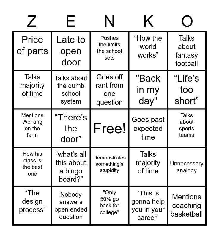 This bingo card has a free space and 24 words: “what’s all this about a bingo board?”, Nobody answers open ended question, Goes off rant from one question, “The design process”, Talks about fantasy football, Price of parts, Talks majority of time, Late to open door, Goes past expected time, Demonstrates something’s stupidity, "Back in my day", Mentions Working on the farm, Talks majority of time, Unnecessary analogy, Talks about the dumb school system, “This is gonna help you in your career”, Talks about sports teams, Pushes the limits the school sets, “Life’s too short”, “There’s the door”, Mentions coaching basketball, How his class is the best one, “How the world works” and "Only 50% go back for college".