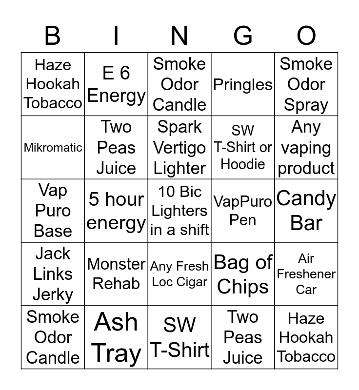 This bingo card has a free space and 24 words: Monster Rehab, Ash Tray, Spark Vertigo Lighter, Smoke Odor Candle, Smoke Odor Spray, Haze Hookah Tobacco, Mikromatic, E 6 Energy, VapPuro Pen, Any Fresh Loc Cigar, SW T-Shirt or Hoodie, Vap Puro Base, Bag of Chips, Air Freshener Car, Two Peas Juice, Two Peas Juice, Candy Bar, Smoke Odor Candle, Any vaping product, 5 hour energy, Haze Hookah Tobacco, Jack Links Jerky, Pringles and SW T-Shirt.