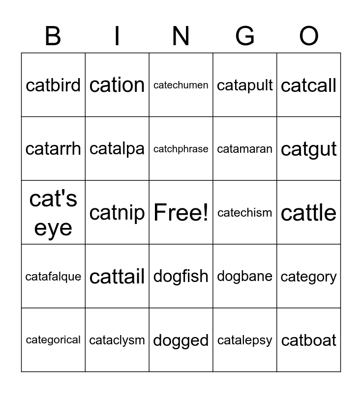 This bingo card has a free space and 61 words: catabolism, cataclysm, catacomb, catafalque, catalepsy, catalog, catalpa, catalysis, catamaran, catamount, catapult, cataract, catarrh, catastrophe, catatonic, catbird, catboat, catcall, catch, catchphrase, catechism, catechumen, categorical, category, cater, caterpillar, caterwaul, catfish, catgut, cathartic, cathedral, catheter, cathode, catholic, cation, catkin, catnap, catnip, CAT scan, cat's eye, catsup, cattail, cattle, catwalk, dogbane, dogcart, dogcatcher, dogear, dogfight, dogfish, dogged, doggerel, doggie bag, dog house, dogie, dogtag, dogma, dogooder, dogtooth violet, dogtrot and dogwood.