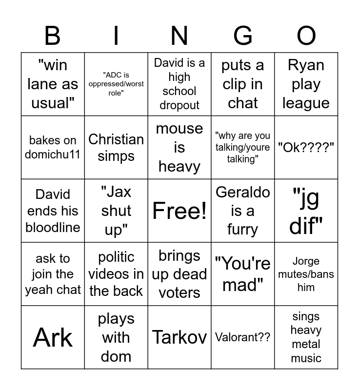 This bingo card has a free space and 25 words: ask to join the yeah chat, plays with dom, Tarkov, Valorant??, Ryan play league, "win lane as usual", "ADC is oppressed/worst role", David is a high school dropout, Geraldo is a furry, Jorge mutes/bans him, bakes on domichu11, Christian simps, jacobs mom in the background, "You're mad", "Ok????", Ark, "Jax shut up", mouse is heavy, "why are you talking/youre talking", "jg dif", David ends his bloodline, politic videos in the back, brings up dead voters, puts a clip in chat and sings heavy metal music.