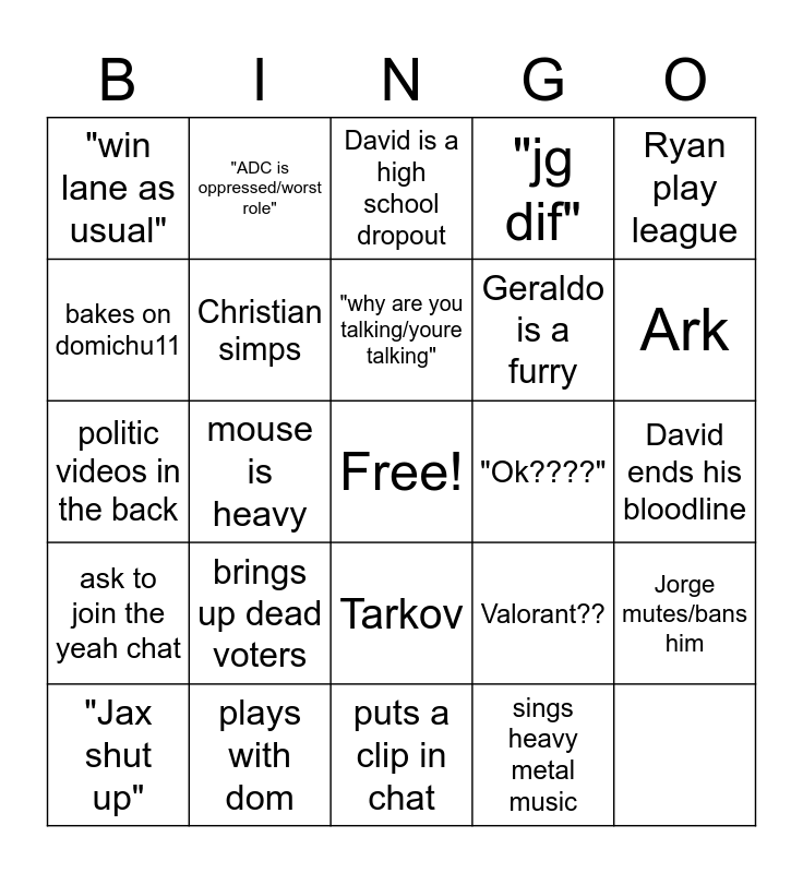 This bingo card has a free space and 24 words: ask to join the yeah chat, plays with dom, Tarkov, Valorant??, Ryan play league, "win lane as usual", "ADC is oppressed/worst role", David is a high school dropout, Geraldo is a furry, Jorge mutes/bans him, bakes on domichu11, Christian simps, "You're mad", "Ok????", Ark, "Jax shut up", mouse is heavy, "why are you talking/youre talking", "jg dif", David ends his bloodline, politic videos in the back, brings up dead voters, puts a clip in chat and sings heavy metal music.