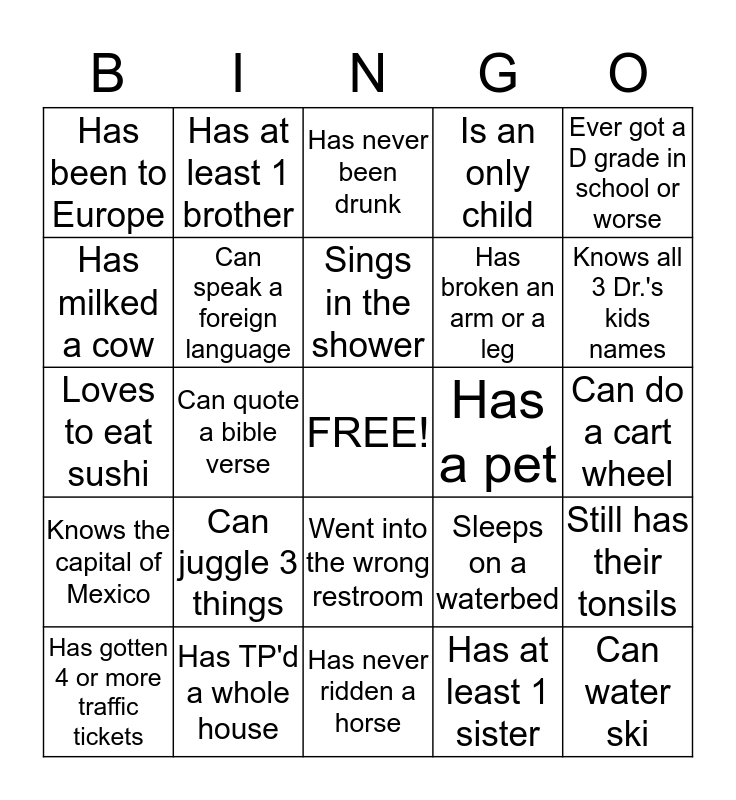 This bingo card has a free space and 24 words: Can juggle 3 things, Has TP'd a whole house, Sings in the shower, Has gotten 4 or more traffic tickets, Ever got a D grade in school or worse, Has been to Europe, Has milked a cow, Has at least 1 brother, Has a pet, Went into the wrong restroom, Has broken an arm or a leg, Loves to eat sushi, Sleeps on a waterbed, Still has their tonsils, Can speak a foreign language, Has at least 1 sister, Can do a cart wheel, Has never been drunk, Knows all 3 Dr.'s kids names, Can quote a bible verse, Can water ski, Knows the capital of Mexico, Is an only child and Has never ridden a horse.