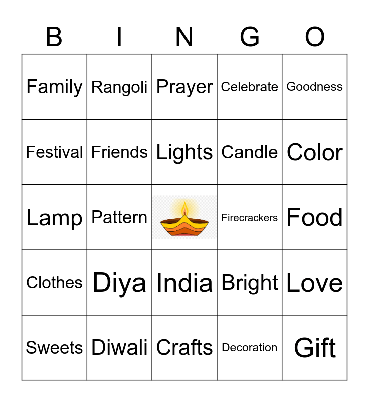 This bingo card has a free space and 24 words: Diya, Diwali, Lights, Sweets, Goodness, Family, Festival, Rangoli, Firecrackers, India, Candle, Lamp, Bright, Love, Friends, Decoration, Food, Prayer, Color, Pattern, Gift, Clothes, Celebrate and Crafts.