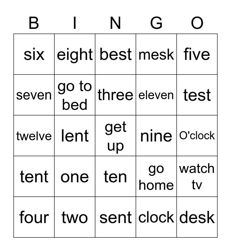 This bingo card has a free space and 24 words: one, two, three, four, five, six, seven, eight, nine, ten, eleven, twelve, go home, watch tv, go to bed, clock, O'clock, best, test, lent, desk, tent, mesk and sent.