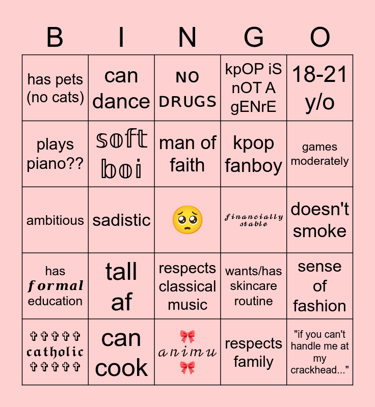 This bingo card has a free space and 24 words: tall af, can cook, man of faith, ✞✞✞✞✞ 𝖈𝖆𝖙𝖍𝖔𝖑𝖎𝖈 ✞✞✞✞✞, 18-21 y/o, has pets (no cats), plays piano??, can dance, 𝓯𝓲𝓷𝓪𝓷𝓬𝓲𝓪𝓵𝓵𝔂 𝓼𝓽𝓪𝓫𝓵𝓮, respects classical music, kpop fanboy, ambitious, wants/has skincare routine, sense of fashion, 𝕤𝕠𝕗𝕥 𝕓𝕠𝕚, respects family, doesn't smoke, ɴᴏ ᴅʀᴜɢꜱ, games moderately, sadistic, "if you can't handle me at my crackhead...", has 𝒇𝒐𝒓𝒎𝒂𝒍 education, kpOP iS nOT A gENrE and 🎀𝒶𝓃𝒾𝓂𝓊 🎀.