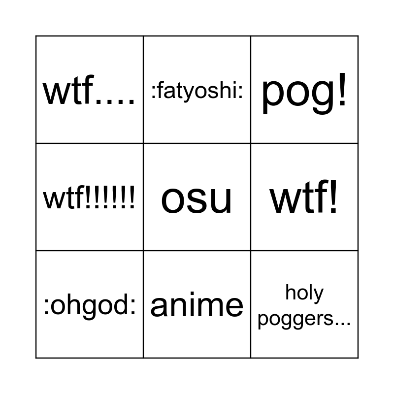 This bingo card has a free space and 8 words: wtf!, pog!, :fatyoshi:, :ohgod:, wtf...., holy poggers..., wtf!!!!!! and anime.