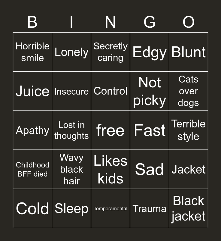 This bingo card has a free space and 24 words: Wavy black hair, Sleep, Control, Cold, Blunt, Horrible smile, Juice, Lonely, Fast, Likes kids, Not picky, Apathy, Sad, Jacket, Insecure, Trauma, Terrible style, Secretly caring, Cats over dogs, Lost in thoughts, Black jacket, Childhood BFF died, Edgy and Temperamental.