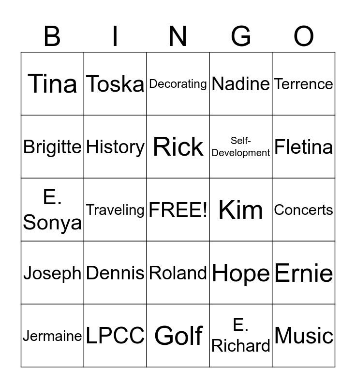 This bingo card has a free space and 70 words: Chantay, Concerts, Gardening, Tameiko, LPCC, History, Nadine, TaMyra, Terrence, Greet, Ernie, Praise, Tina, Decorating, Jessica, Traveling, Roland, Self-Development, Newlywed, Joseph, Kim, Hope, Fletina, Movies, Linda, Embarly, Patience, M. L'Tanya, E. Richard, Family, Toska, Fashion, Becky, Cooking, Helen, Sharon, Scrapbooking, Skating, Pamela, Brigitte, Reading, Dennis, Music, Tay, JESUS, History, Jermaine, Swimming, Joy, Diane, Honor, Dancing, Margie, Bowling, Golf, Smile, Rick, Worshipping, Minnie, Shopping, E. Sonya, Humble, Ms. Johnnie, Blues, Yardsales, Cynthia, Shopping, Sheree, Liberty and Laughter.