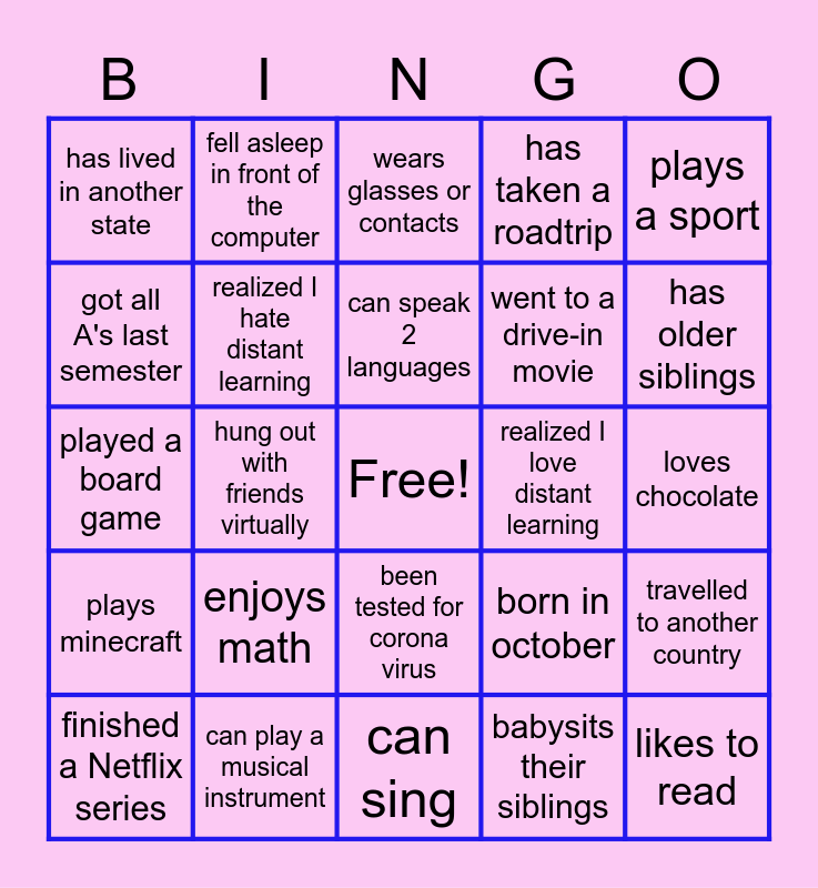This bingo card has a free space and 24 words: enjoys math, can play a musical instrument, can speak 2 languages, finished a Netflix series, plays a sport, has lived in another state, got all A's last semester, fell asleep in front of the computer, realized I love distant learning, been tested for corona virus, went to a drive-in movie, played a board game, born in october, travelled to another country, realized I hate distant learning, babysits their siblings, loves chocolate, wears glasses or contacts, has older siblings, hung out with friends virtually, likes to read, plays minecraft, has taken a roadtrip and can sing.