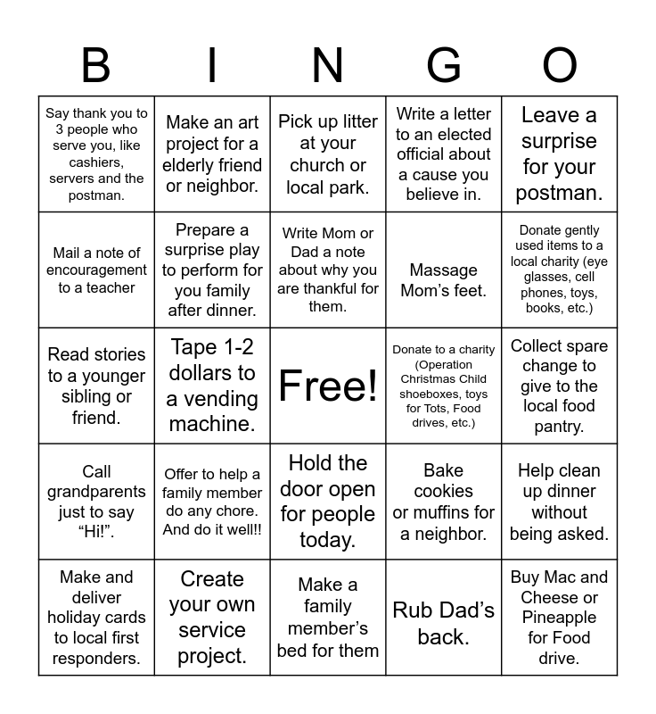 This bingo card has a free space and 27 words: Bake cookies or muffins for a neighbor., Rake leaves for a neighbor., Massage Mom’s feet., Make a family member’s bed for them, Mail a note of encouragement to a teacher, Pick up litter at your church or local park., Make an art project for a elderly friend or neighbor., Call grandparents just to say “Hi!”., Donate to a charity (Operation Christmas Child shoeboxes, toys for Tots, Food drives, etc.), Help clean up dinner without being asked., Read stories to a younger sibling or friend., Write a letter to an elected official about a cause you believe in., Make and deliver holiday cards to local first responders., Create your own service project., Donate gently used items to a local charity (eye glasses, cell phones, toys, books, etc.), Donate diapers to the PRC or pet food to the animal shelter., Prepare a surprise play to perform for you family after dinner., Write Mom or Dad a note about why you are thankful for them., Offer to help a family member do any chore. And do it well!!, Say thank you to 3 people who serve you, like cashiers, servers and the postman., Collect spare change to give to the local food pantry., Rub Dad’s back., Tape 1-2 dollars to a vending machine., Buy Mac and Cheese or Pineapple for Food drive., Hold the door open for people today., Leave a surprise for your postman. and Leave bubbles on a friend's door step..