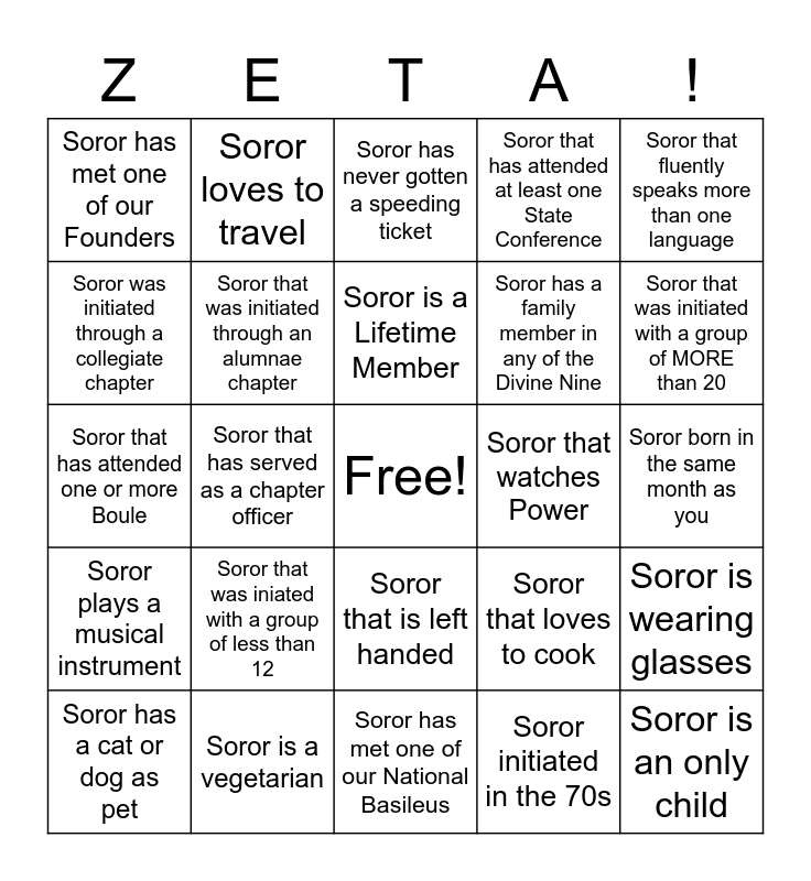 This bingo card has a free space and 24 words: Soror that was iniated with a group of less than 12, Soror is a vegetarian, Soror is a Lifetime Member, Soror has a cat or dog as pet, Soror that fluently speaks more than one language, Soror has met one of our Founders, Soror was initiated through a collegiate chapter, Soror loves to travel, Soror that watches Power, Soror that is left handed, Soror has a family member in any of the Divine Nine, Soror that has attended one or more Boule, Soror that loves to cook, Soror is wearing glasses, Soror that was initiated through an alumnae chapter, Soror initiated in the 70s, Soror born in the same month as you, Soror has never gotten a speeding ticket, Soror that was initiated with a group of MORE than 20, Soror that has served as a chapter officer, Soror is an only child, Soror plays a musical instrument, Soror that has attended at least one State Conference and Soror has met one of our National Basileus.