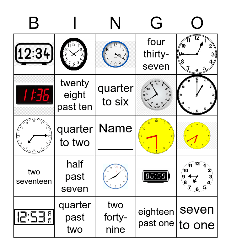 This bingo card has 14 images, a free space and 10 words: half past seven, quarter past two, quarter to six, twenty eight past ten, eighteen past one, quarter to two, seven to one, two seventeen, four thirty-seven and two forty-nine.
