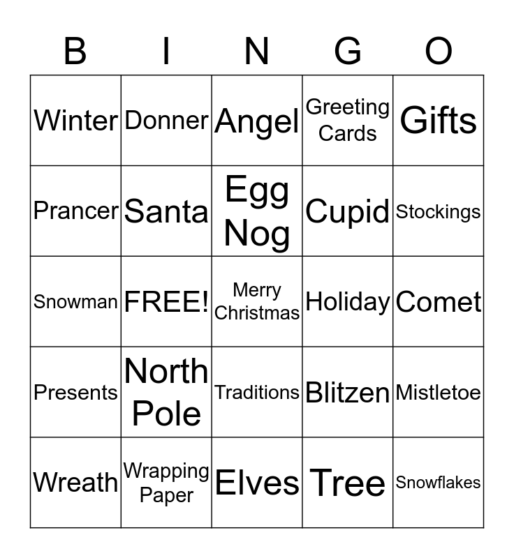 This bingo card has a free space and 24 words: North Pole, Wrapping Paper, Egg Nog, Wreath, Gifts, Winter, Prancer, Donner, Holiday, Traditions, Cupid, Snowman, Blitzen, Mistletoe, Santa, Tree, Comet, Angel, Stockings, FREE!, Snowflakes, Presents, Greeting Cards and Elves.