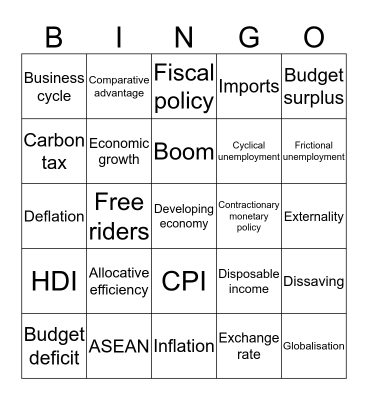 This bingo card has a free space and 24 words: Allocative efficiency, ASEAN, Boom, Budget deficit, Budget surplus, Business cycle, Carbon tax, Comparative advantage, Contractionary monetary policy, CPI, Cyclical unemployment, Deflation, Disposable income, Dissaving, Economic growth, Exchange rate, Externality, Fiscal policy, Frictional unemployment, Free riders, Globalisation, HDI, Imports and Inflation.