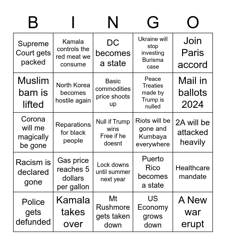 This bingo card has a free space and 24 words: Gas price reaches 5 dollars per gallon, Kamala takes over, Basic commodities price shoots up, Police gets defunded, Join Paris accord, Supreme Court gets packed, Muslim bam is lifted, Kamala controls the red meat we consume, Riots will be gone and Kumbaya everywhere, Lock downs until summer next year, Peace Treaties made by Trump is nulled, Corona will me magically be gone, Puerto Rico becomes a state, Healthcare mandate, North Korea becomes hostile again, US Economy grows down, 2A will be attacked heavily, DC becomes a state, Mail in ballots 2024, Reparations for black people, A New war erupt, Racism is declared gone, Ukraine will stop investing Burisma case and Mt Rushmore gets taken down.