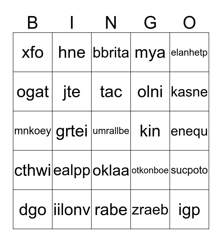 This bingo card has 25 words: ealpp, rabe, tac, dgo, elanhetp, xfo, ogat, hne, kin, oklaa, olni, mnkoey, otkonboe, sucpoto, jte, igp, enequ, bbrita, kasne, grtei, umrallbe, iilonv, cthwi, mya and zraeb.