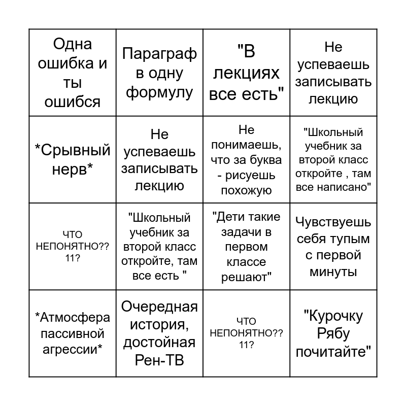 This bingo card has 20 words: Чувствуешь себя тупым с первой минуты, "Ну ладно, поехали дальше", "В лекциях все есть", С первого раза экзамен сдают только боги, *Атмосфера пассивной агрессии*, *Срывный нерв*, Очередная история, достойная Рен-ТВ, Одна ошибка и ты ошибся, ЧТО НЕПОНЯТНО??11?, Параграф в одну формулу, "Школьный учебник за второй класс откройте, там все есть ", "Дети такие задачи в первом классе решают", Не успеваешь записывать лекцию, "Курочку Рябу почитайте", Не понимаешь, что за буква - рисуешь похожую, Алфавит с планеты Нибиру, "Школьный учебник за второй класс откройте , там все написано", Не успеваешь записывать лекцию, ЧТО НЕПОНЯТНО??11? and "Ну ладно, поехали дальше".