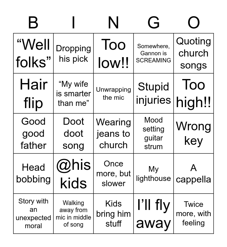 This bingo card has a free space and 25 words: @his kids, Kids bring him stuff, Unwrapping the mic, Story with an unexpected moral, Quoting church songs, “Well folks”, Hair flip, Dropping his pick, Mood setting guitar strum, Once more, but slower, Stupid injuries, Good good father, My lighthouse, A cappella, “My wife is smarter than me”, Pick intro, Wrong key, Too low!!, Too high!!, Doot doot song, Twice more, with feeling, Walking away from mic in middle of song, Head bobbing, Somewhere, Gannon is SCREAMING and I’ll fly away.