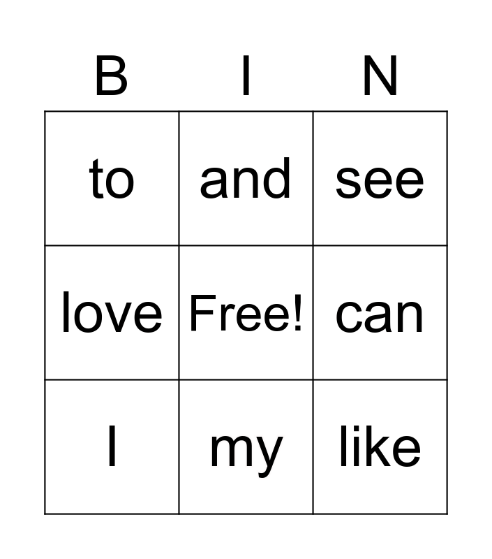 This bingo card has a free space and 10 words: my, see, to, like, love, I, and, the, can and play.