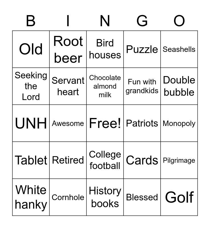 This bingo card has a free space and 44 words: Narnia, Golf, Martha's Vineyard, White hanky, Humble, Blessed, Bird houses, Flowers, Seashells, Cornhole, Puzzle, Patriots, College football, Retired, Music, History books, Beach, UNH, janasta, Double bubble, Root beer, Cookies, Yardwork, Old, Smart, Monopoly, Snow, Florida, Cards, Tablet, Word scapes, Pilgrimage, Football, Bocce, Awesome, Lollipops, Skittles, Ice cream, Chocolate almond milk, Seeking the Lord, Fun with grandkids, Love of others, Servant heart and Followers of Jesus.