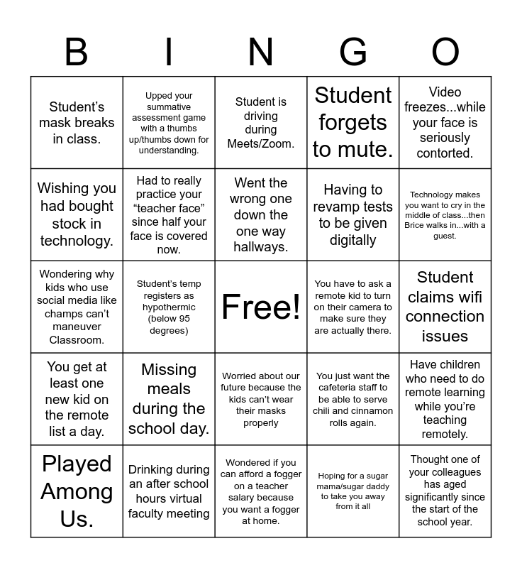 This bingo card has a free space and 69 words: Only the forehead is visible on the webcam, Student claims wifi connection issues, At least one student forgets to hit the turn in button to submit an assignment, Student shows off their pet during remote learning, Drinking during an after school hours virtual faculty meeting, Conducted an interview via a virtual format, Student forgets to mute., You forget to mute yourself., Video freezes...while your face is seriously contorted., Realizing how technologically ignorant you really are., Have children who need to do remote learning while you’re teaching remotely., Forgotten your mask at least once., Student’s mask breaks in class., Student is driving during Meets/Zoom., You’ve considered early retirement., Student’s temp registers as hypothermic (below 95 degrees), Worried about our future because the kids can’t wear their masks properly, Having to revamp tests to be given digitally, Ready to use Zoom because of its convenience and ease over Meets., You get at least one new kid on the remote list a day., You have to ask a remote kid to turn on their camera to make sure they are actually there., You just want the cafeteria staff to be able to serve chili and cinnamon rolls again., Technology makes you want to cry in the middle of class...then Brice walks in...with a guest., Wondered how you’re going to manage to get some PD hours toward recertification, Gained weight since the school year started., Daydreamed about beating up the people who say teachers shouldn’t get paid when schools are remote., Wondering if today is the day that the school is forced to go all remote., Worried you had something stuck between your teeth while your mask was on., Hoping for a sugar mama/sugar daddy to take you away from it all, Hoping this school year is the only one that is FUBARED., Upped your summative assessment game with a thumbs up/thumbs down for understanding., Have to remind kids at least once a day to put their mask over their nose., Evaluations in 2020??? Whatever!, Lost weight since the school year started., Texting a colleague during a meeting (in-person or virtual)., Child/pet/spouse pops onto the screen during a remote meeting., Wondered where you went wrong when former students post conspiracy theories related to anything about 2020., Power outages take on a whole new meaning., Wishing you had bought stock in technology., Exhausted is too mild of a term to describe your state of being., Missing meals during the school day., Thought one of your colleagues has aged significantly since the start of the school year., Pulling up the seating chart on Skyward and realizing what your students look like without masks., Considered working for ISBE just so they have one teacher on staff., Judged colleagues for how well they’re washing their hands., Played Among Us., Knew what Among Us was before the staff costume., Wondered if there was a way to sanitize the people in your classroom., Watched Tiger King while remote last year., Had to really practice your “teacher face” since half your face is covered now., Went the wrong one down the one way hallways., Having your week planned out and then having to miss because you/your child show COVID symptoms., Considered taking cleaning supplies/paper products from school to use at home., Wondered if you can afford a fogger on a teacher salary because you want a fogger at home., Another teacher comes into your camera view either during class or a virtual meeting., Realize people need to make a living, but feel like you’re going to lose it if you get one more email from an “education company” wondering if you are prepared for remote learning., Hoping your desktop computer makes it to the end of the year since it runs your Smartboard or Promethean board., Wondering if the teachers lounge still exists., Became an expert on the brand of hand lotion that combats the dry hand syndrome from washing/sanitizing., Wondering why kids who use social media like champs can’t maneuver Classroom., Given issues with Google, had some variation of the thought that Google had one job..., Considered a workshop given by someone without any classroom experience just to get PD hours., Missed meals due to teaching or anything related to teaching., Missing your lunch crew., The 50/50 has become the highlight of your week., Having to repeat what in-person students say so remote students hear., Realizing your lunch choices are even more important since you’re breathing that smell for the rest of the day., Thursday is the new Monday. and Being extremely proud of former students when they post or cite articles debunking conspiracy theories..